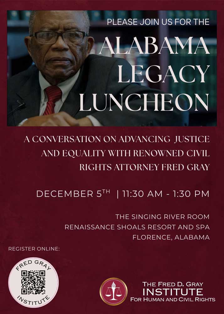 Thank you for your interest — the Alabama Legacy Luncheon is officially sold out, and registration is currently closed. For any questions or assistance, please contact laura@fredgrayinstitute.org.